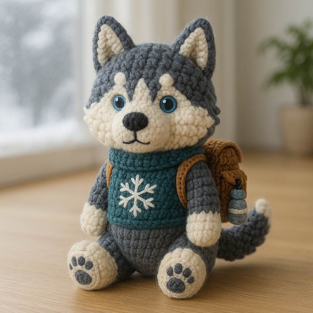 Meet the Crochet Husky Plush – Winter Explorer Edition, a heartwarming handmade creation that brings cozy winter charm to any home. Carefully crocheted with soft premium yarn, this adorable husky features expressive blue eyes, a teal sweater embroidered with a snowflake, and a tiny travel backpack with a mini bottle accessory. Every stitch tells a story of adventure, warmth, and craftsmanship, making it the perfect companion for both kids and collectors.
