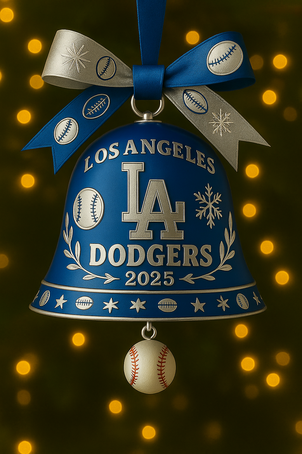 Celebrate the spirit of baseball and the pride of Los Angeles with the Dodgers 2025 Commemorative Bell Ornament. Designed in the teamâs signature blue and silver, this stunning holiday piece combines festive charm with championship elegance. The bell features the bold âLAâ insignia surrounded by engraved baseball motifs, snowflakes, and laurel branches, symbolizing victory and unity. A gleaming metallic baseball hangs beneath as the clapper, completing the perfect balance of sport and celebration.