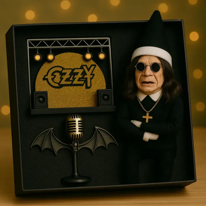 这款奥兹圣诞精灵玩偶将摇滚乐和圣诞节的精神完美融合,成为一件令人难忘的收藏品。玩偶身着经典的黑色精灵装束,配以白色毛绒袖口和尖顶帽,还佩戴着标志性的圆形太阳镜和金色十字架项链——完美地融合了幽默、魅力和摇滚态度。